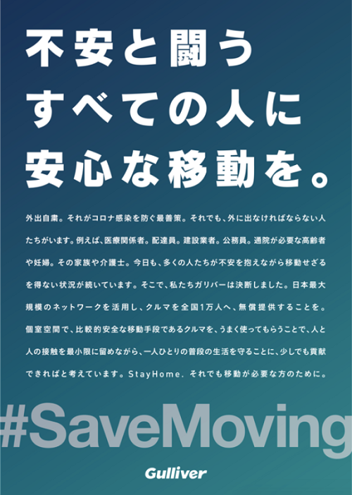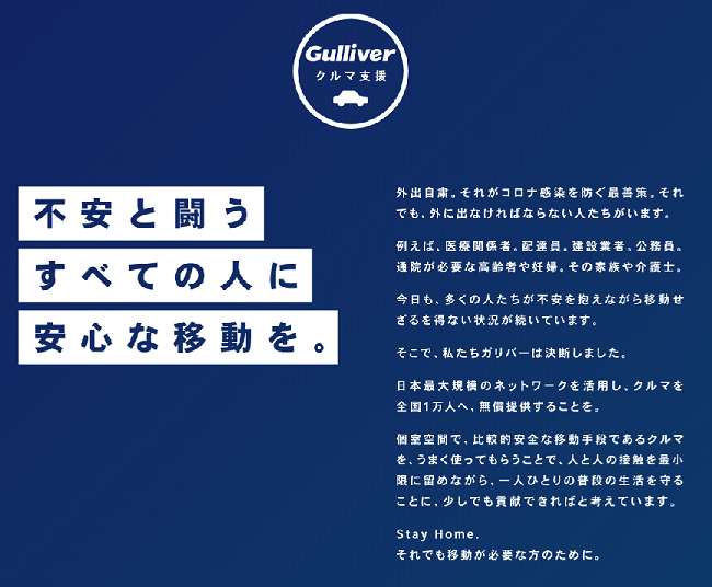 中古車事業Gulliver(ガリバー)を運営する株式会社IDOMが、先日政府が緊急事態宣言を発令したことを受け、医療従事者をはじめとした移動を必要とするすべての方の移動に関する不安を取り除くために、1万名の方に無償で最大3か月間貸し出しすることを発表しました。